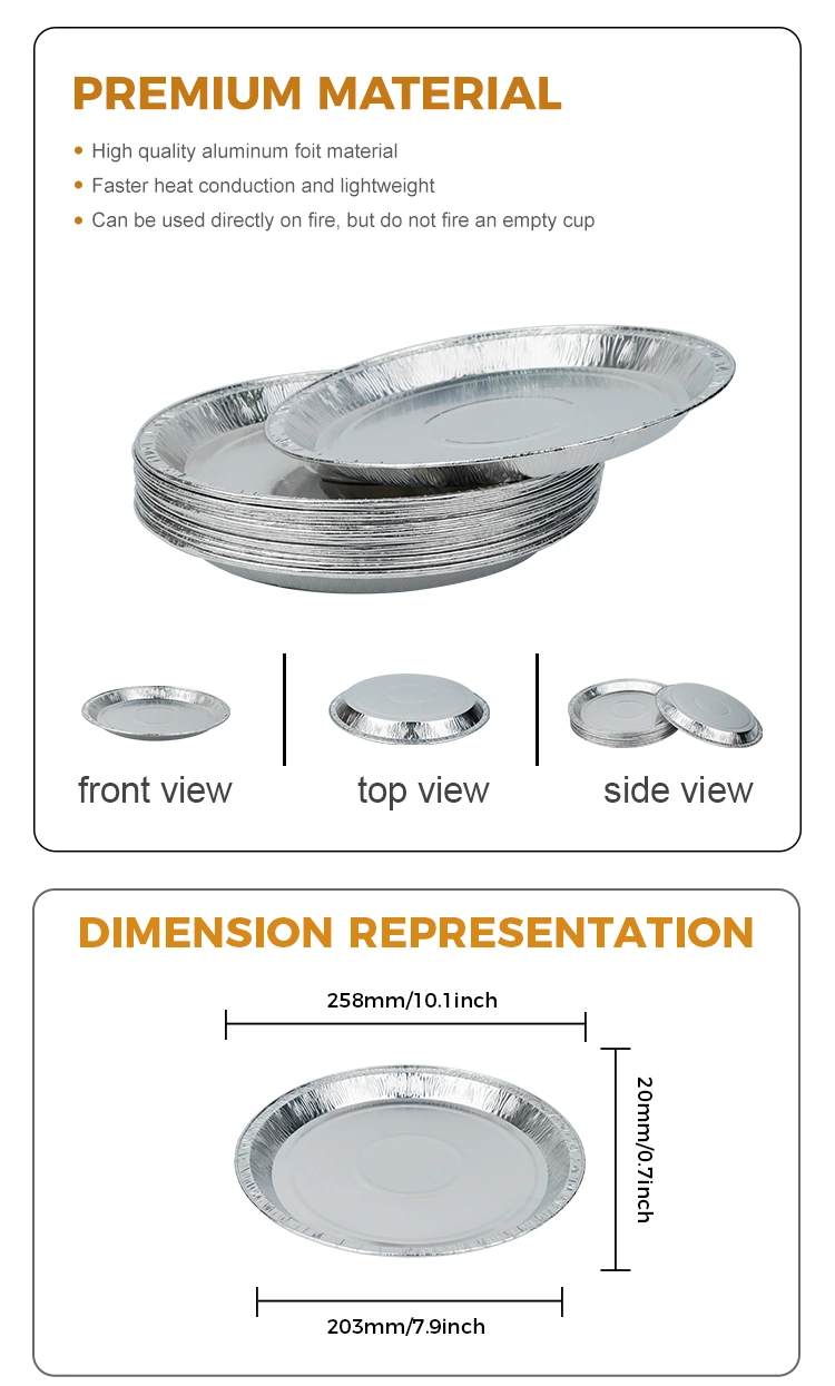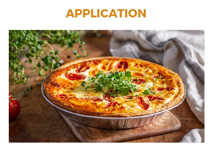 Folia aluminiowa Yunchu oferuje 10 -calowe srebrne pojemniki z folii aluminiowej z nr 13110. Produkt ma górną średnicę 258 mm (około 10,1 cala), niższą średnicę 203 mm (około 7,9 cala) i wysokość 20 mm (około 0,7 cala). Przy pojemności około 695 ml (około 24,5 uncji) nadaje się do pieczenia pizzy bez przyklejenia, łatwego do zwolnienia z formy i nie ma zapachu. Ponadto jego podwyższona konstrukcja krawędzi zapobiega rozlaniu składników i zwiększa praktyczność. Możemy również świadczyć usługi dostosowywania logo, aby pomóc Ci pogłębić wrażenie klientów i zwiększyć świadomość marki.