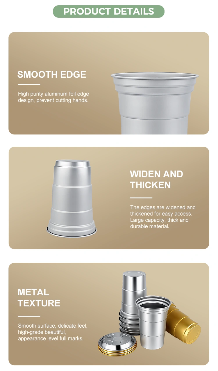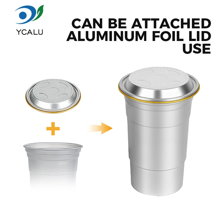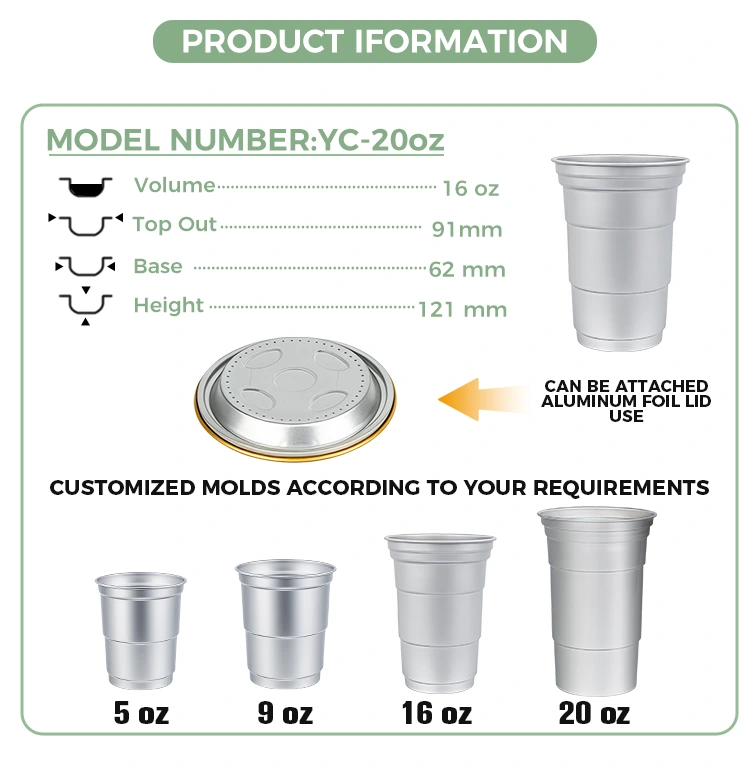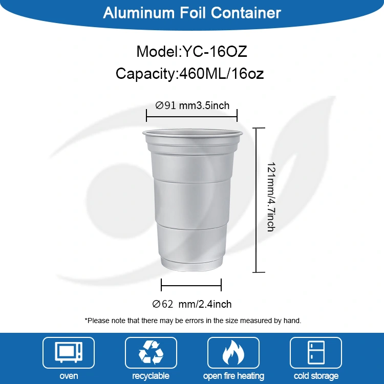 W przeciwieństwie do pojemników ogólnych, jednorazowy kubek na napoje z folii aluminiowej Yunchu o pojemności 16 uncji został specjalnie zaprojektowany, aby zapewnić rozwiązania w zakresie opakowań dla marek w określonych scenariuszach. Dzięki kompaktowym rozmiarom (460 mililitrów) ten konfigurowalny, jednorazowy kubek na napoje z folii aluminiowej o pojemności 16 uncji zaspokaja zwyczaje konsumpcyjne jednorazowych napojów instant. Te niestandardowe jednorazowe kubki imprezowe z folii aluminiowej o pojemności 16 uncji, poza swoimi praktycznymi funkcjami, szczególnie nadają się na wynos, na targi lub na kemping. Przede wszystkim może pomóc zwiększyć wartość marki.