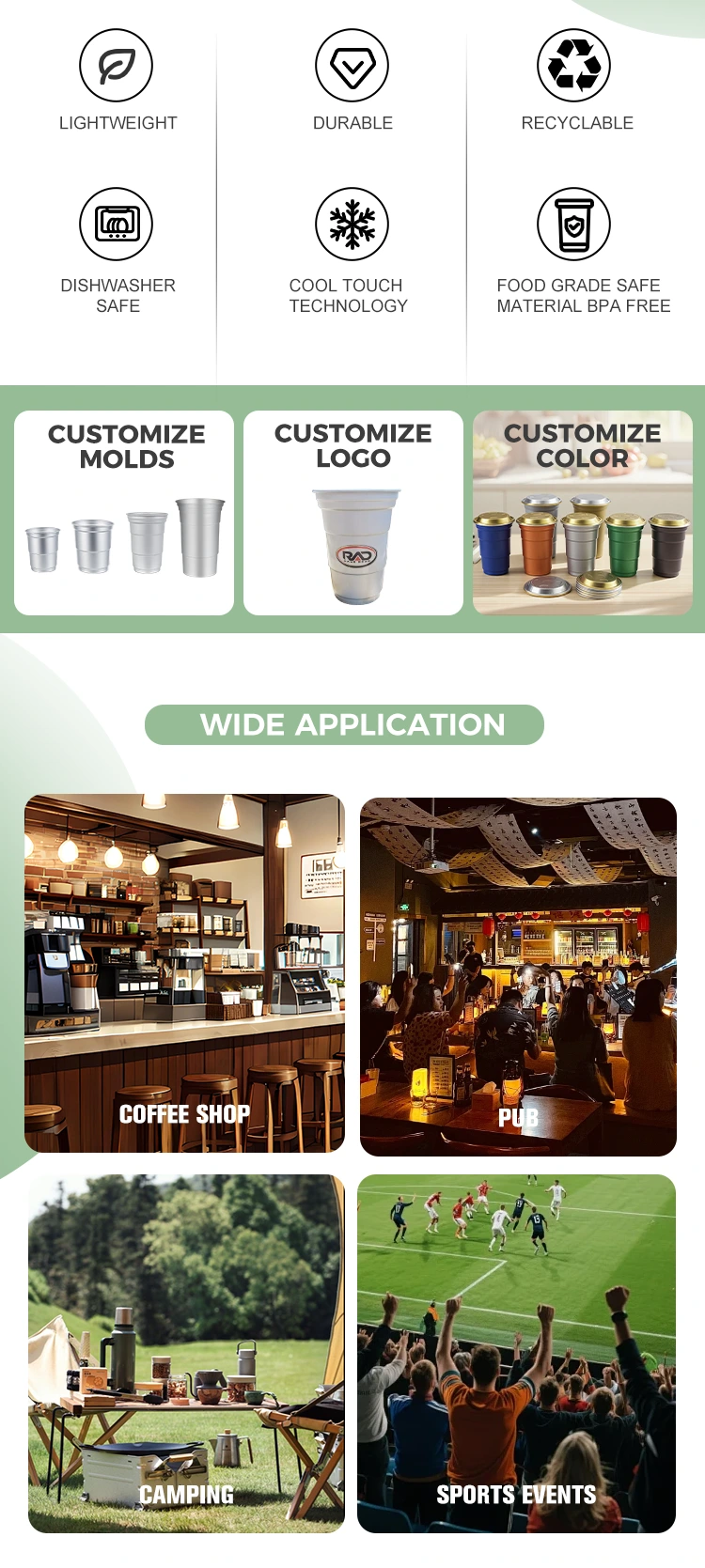 Ten jednorazowy kubek na piwo i kawę o pojemności 16 uncji, wykonany na zamówienie, z folii aluminiowej, można umieścić bezpośrednio w lodówce w celu chłodzenia. Podczas przechowywania zimnych napojów przewodność cieplna materiału aluminiowego pomaga utrzymać niską temperaturę.