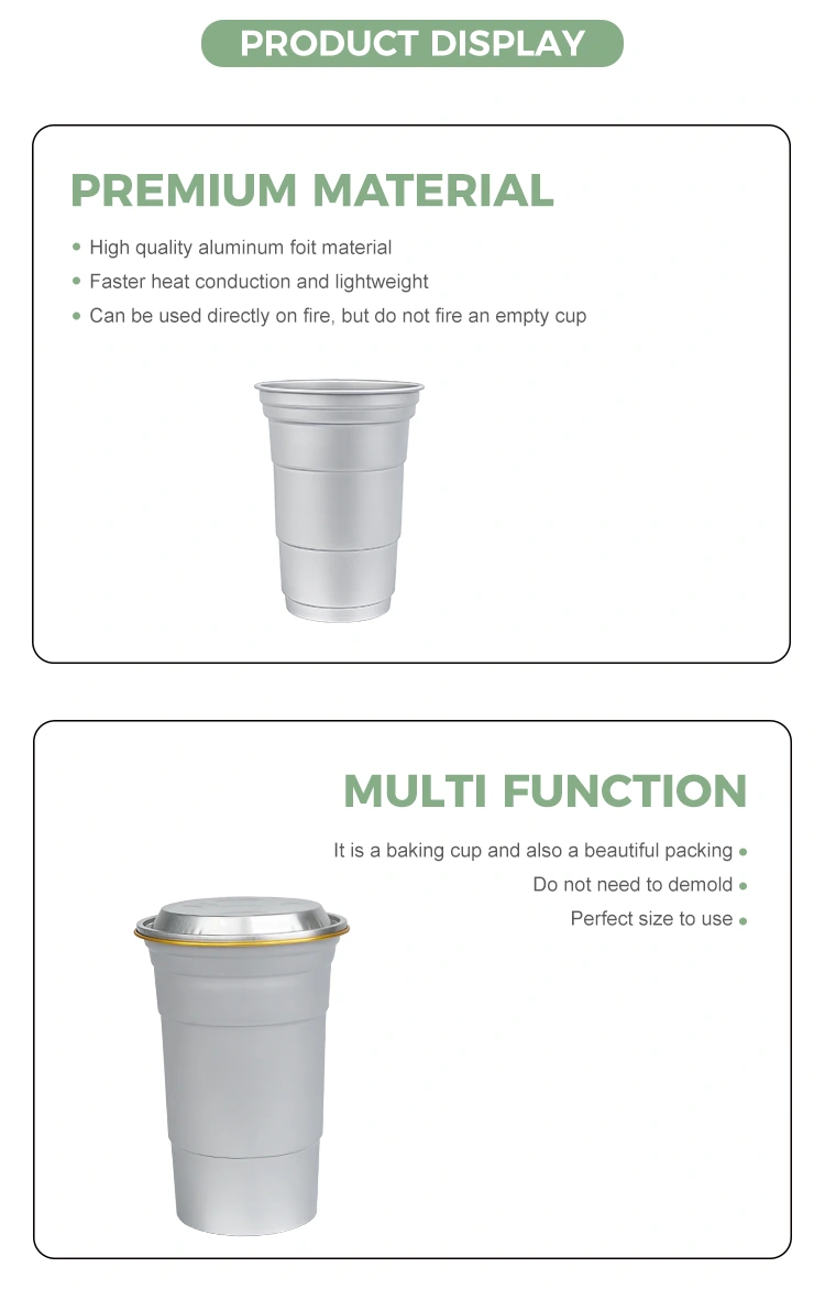 Yunchu jest wiodącym chińskim producentem niestandardowych jednorazowych kubków na napoje z folii aluminiowej o pojemności 16 uncji. Ten jednorazowy kubek do picia z folii aluminiowej o pojemności 16 uncji to 460-mililitrowy kubek z folii aluminiowej, odpowiedni do standardowych napojów, takich jak kawa i piwo. Ma ustandaryzowany projekt i jest skierowany głównie do użytkowników komercyjnych, takich jak kawiarnie i bary rzemieślnicze, którzy często potrzebują dostosowywania. Zapewniając efektywne przewodzenie ciepła i podstawowe właściwości uszczelniające, ten jednorazowy kubek na napoje z folii aluminiowej o pojemności 16 uncji, nadający się do recyklingu, kładzie również większy nacisk na szybkie i elastyczne usługi dostosowywania wizualnego marki.