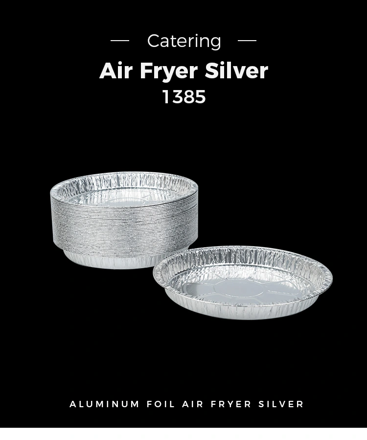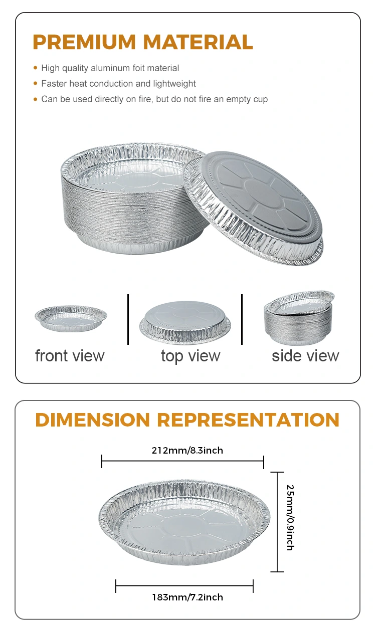 Model folii aluminiowej Yunchu 1385 7-9 cali pizzy srebrne pojemniki na folii aluminiowe o górnej średnicy 212 mm (8,3 cala), dolna średnica 183 mm (7,2 cala), wysokość 25 mm (0,9 cala). Przy pojemności około 680 ml (23,9 uncji) nadaje się do pieczenia pizzy i innych wypieków o gładkiej powierzchni, niestykającym, łatwym uwalnianiu i bez zapachu. Podniesiona konstrukcja krawędzi zapobiega wylaniu składników i poprawie wydajności pieczenia. Ponadto kontener może świadczyć usługi dostosowywania logo, które mogą pomóc w pogłębieniu wrażeń klientów i ulepszyć wizerunek marki.