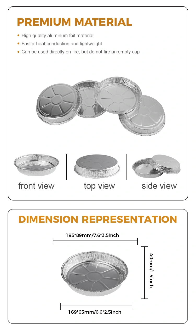 Folia aluminiowa Yunchu oferuje 7 -calowe pomarszczone pojemniki na patelnia z pizzą srebrną folią aluminiową z numerem modelu 5067. Produkt ma górną średnicę 168 mm (około 6,6 cala), niższą średnicę 145 mm (ok. 5,7 cali) i wysokość 25 mm (około 0,9 cala). Przy pojemności około 400 ml (około 14,1 uncji) idealnie nadaje się do pieczenia pizzy bez przyklejania się podczas pieczenia, łatwej do uwolnienia formy i bez zapachu. Ponadto jego w pełni zaokrąglony projekt zapobiega wyleczeniu żywności, zwiększając praktyczność. Możemy również świadczyć usługi dostosowywania logo, aby pomóc Ci pogłębić wrażenie klientów i zwiększyć widoczność Twojej marki.