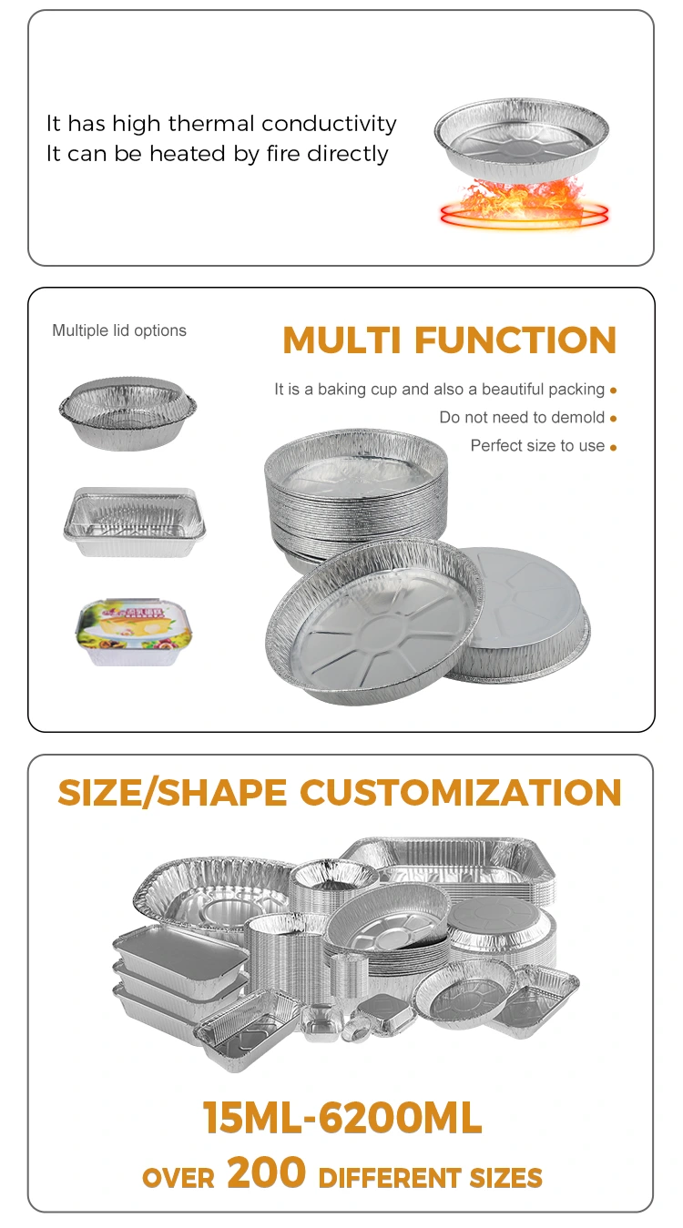 Folia aluminiowa Yunchu oferuje 7 -calowe pomarszczone kontenery folii srebrnej folii z aluminium z numerem 5067. Produkt ma górną średnicę 168 mm (około 6,6 cala), niższą średnicę 145 mm (ok. 5,7 cali) i wysokość 25 mm (ok. 0,9 cali). Przy pojemności około 400 ml (około 14,1 uncji) idealnie nadaje się do pieczenia pizzy bez przyklejania się podczas pieczenia, łatwej do uwolnienia formy i bez zapachu. Ponadto jego w pełni zaokrąglony projekt zapobiega wyleczeniu żywności, zwiększając praktyczność. Możemy również świadczyć usługi dostosowywania logo, aby pomóc Ci pogłębić wrażenie klientów i zwiększyć widoczność Twojej marki.