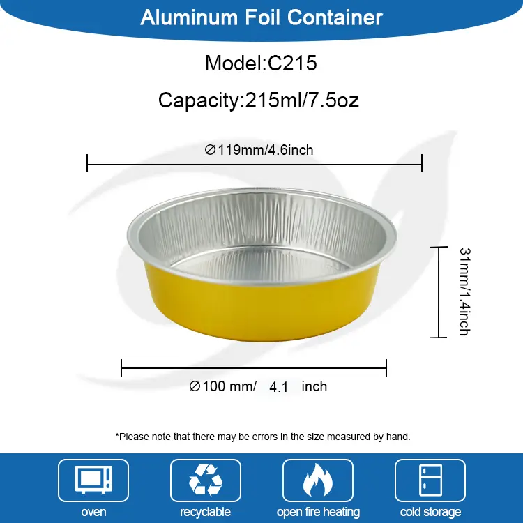 Łączne pojemniki z folii aluminiowej aluminium jednorazowe okrągłe pojemniki z folii gotźnią gotźnią, górna: 110 mm, 4,3 ", dolna 100 mm, 4", wysokość: 31 mm 1,2 ", zawiera 215 ml/8,5 uncji. Projekt gładkiej powierzchni, niewielkie fałdy produktu skutecznie wzmacniają opakowanie przeciwpoślizgowe, dostosowanie zapasów przeciwpoślizgowych, nieosiągalne dla produktów pielęgnacyjnych, nieosiągalnych dla planów produkcyjnych, a także zapakowań liniowych. weryfikowane przez rynek i był szeroko rozpoznawany przez klientów i fabryki.