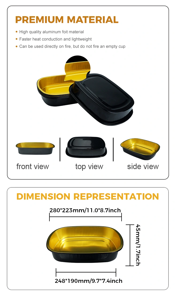 Dostawca folii z aluminium Yunchu Do dyspozycji czarne złoto prostokątne pojemniki z folii aluminiowej są odpowiednie do przemysłu cateringowego i na wynos, szczególnie do materiału do pieczenia, łańcuchów gastronomicznych i samowystarczalnych łańcuchów i innych scenariuszy, wiele scenariuszy, wiele scenariuszy i innych scenariuszy i innych scenariuszy jest wykonany Składniki do umieszczenia mogą być stosowane z aluminiową pokrywą uszczelniającą i PET w pełni przezroczystą pokrywą, o doskonałej wydajności uszczelnienia, odporności na wysoką temperaturę oraz funkcją zapobiegania oleju i wycieku. Jest szeroko stosowany w różnych scenariuszach, takich jak opakowanie żywności, ogrzewanie, chłodzenie i dostarczanie na wynos. Powierzchnia przyjmuje lekką konstrukcję ściany, z płaskim i gładkim wyglądem, który jest wygodny do automatycznego uszczelnienia folii uszczelnionej cieplnej, poprawia w ten sposób wydajność opakowania.