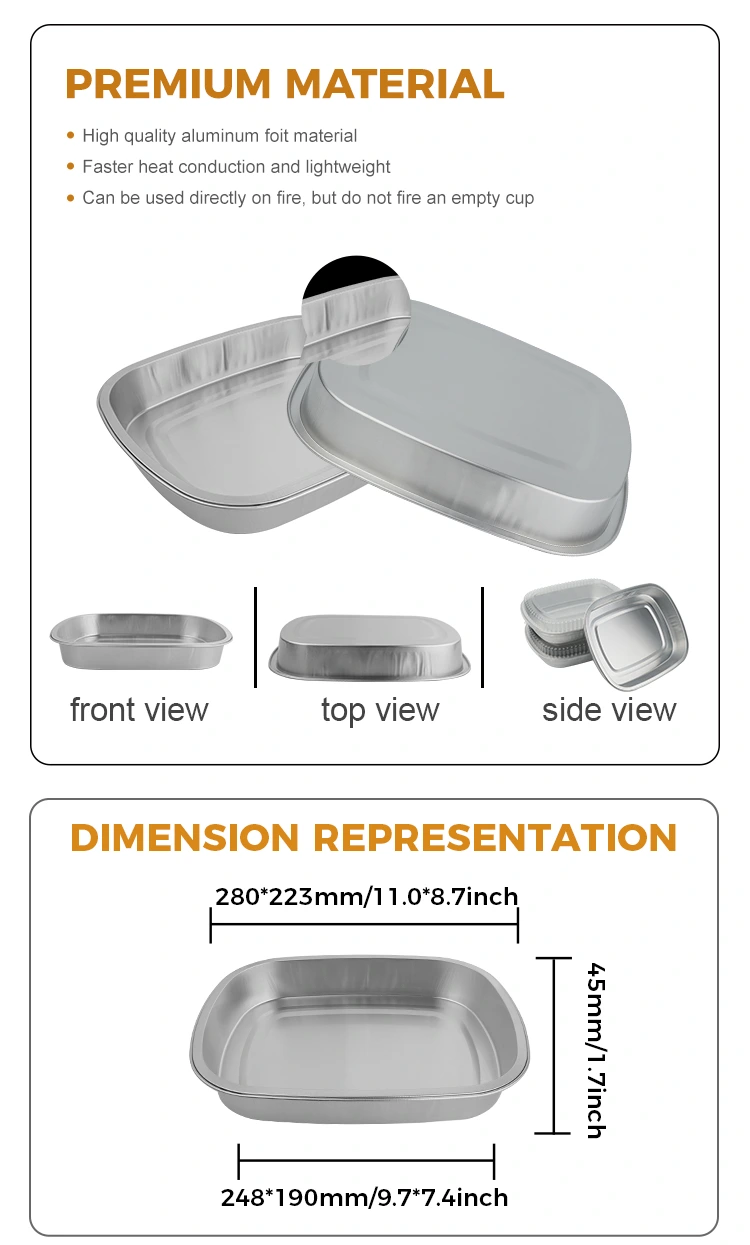 4. Kwadratowe pojemniki na żywność na wynos z folii aluminiowej mają proste i schludne linie, uzupełnione nowoczesnym srebrnym połyskiem. Może poprawić atrakcyjność wizualną żywności i ogólną jakość, pomagając wzmocnić profesjonalny i ekskluzywny wizerunek marki.