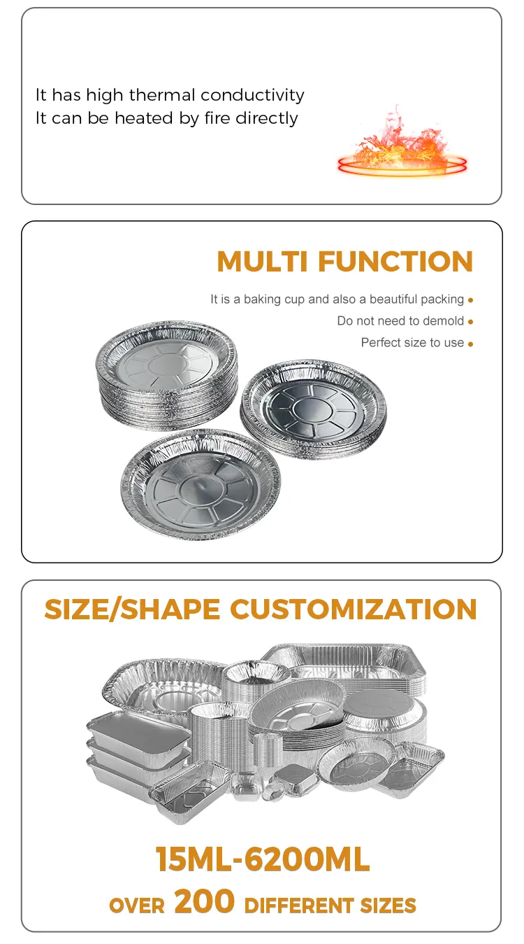 Jednorazowa frytkownica powietrzna z folią aluminiową Yunchu Srebrny pojemnik z folii aluminiowej jest higieniczny i przyjazny dla środowiska. Wykonany jest z zagęszczonych i odpornych na korozję materiałów, które nie ulegają łatwo odkształceniom i mogą mieć bezpośredni kontakt z żywnością. Nie boi się wysokich temperatur, nie jest przypalany, nie przypalany i niełatwy do wyrzucenia. Wytrzymuje wysokie temperatury do 250°C i nadaje się do różnych metod gotowania, takich jak pieczenie w wysokiej temperaturze, piekarnik i grill, więc nie ma się czym martwić. Dostępnych jest wiele specyfikacji spełniających zróżnicowane potrzeby w zakresie pieczenia o różnych rozmiarach, co pozwala łatwo sprostać różnym wymaganiom związanym z produkcją żywności.