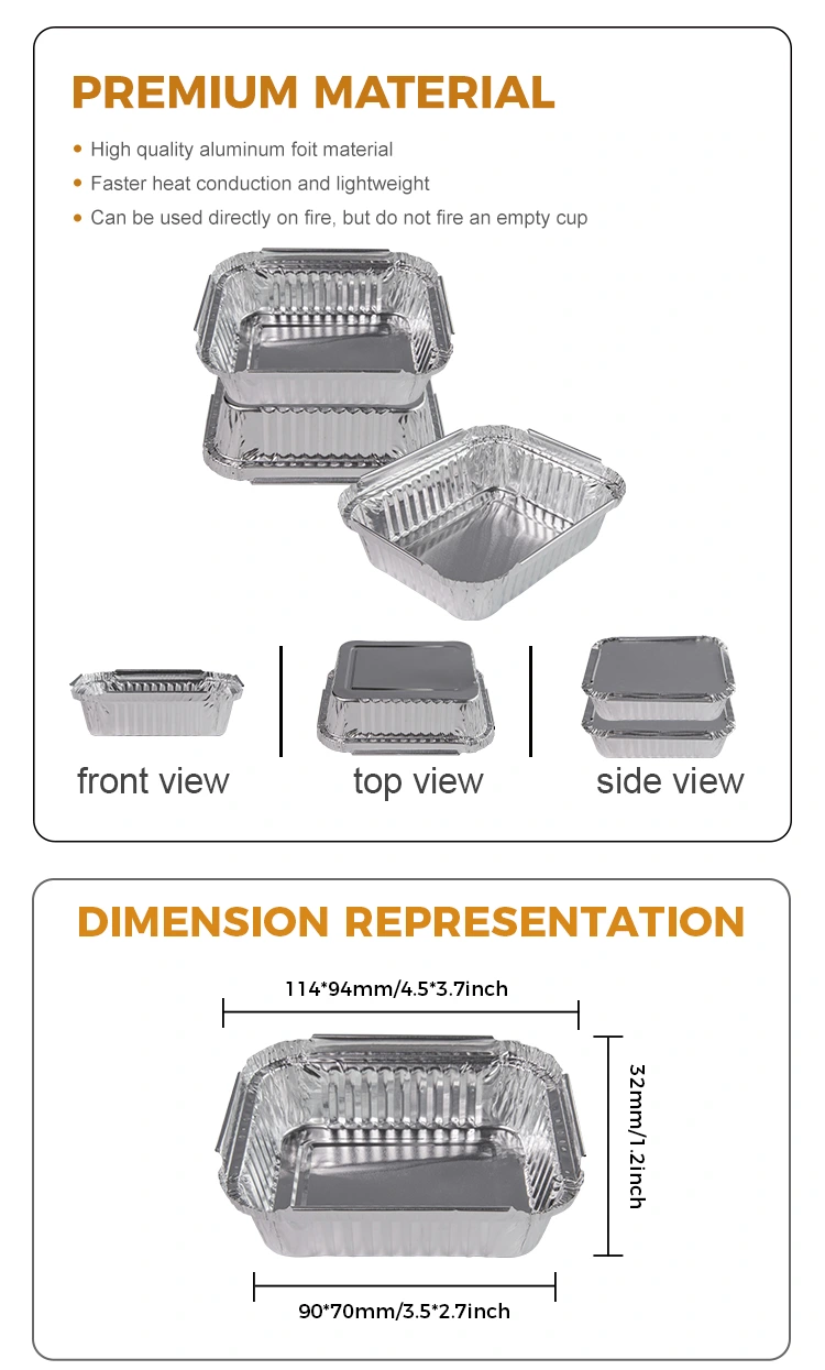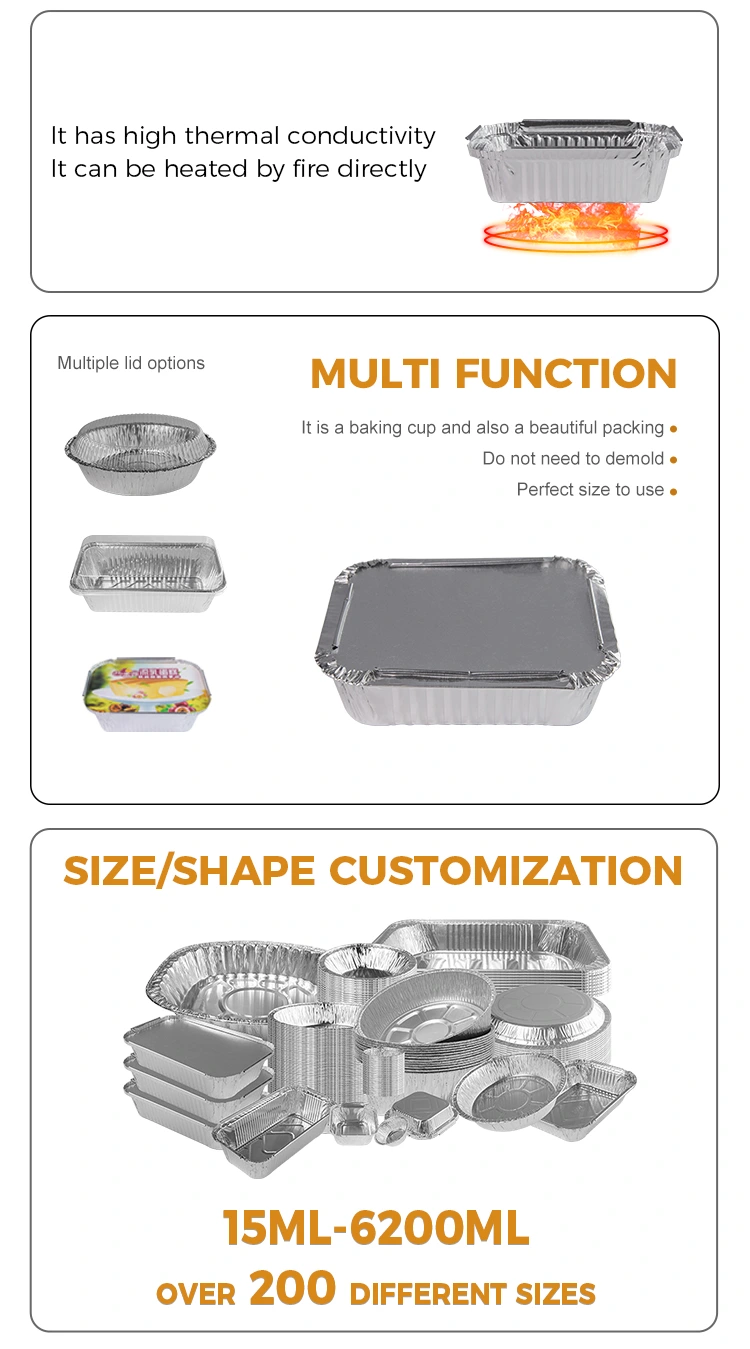 Wykonalne pojemniki z folii z folii aluminiowej Yunchu srebrne pojemniki z folii aluminiowej są wytwarzane z wysokiej jakości materiału srebrnego o klasy spożywczej 8011-0. Produkt ten jest przeznaczony do różnych produktów spożywczych, takich jak grillowanie, pieczenie, frytkownicy powietrza i gotowe potrawy, szczególnie dla tych, którzy lubią grille na świeżym powietrzu i spotkania rodzinne.