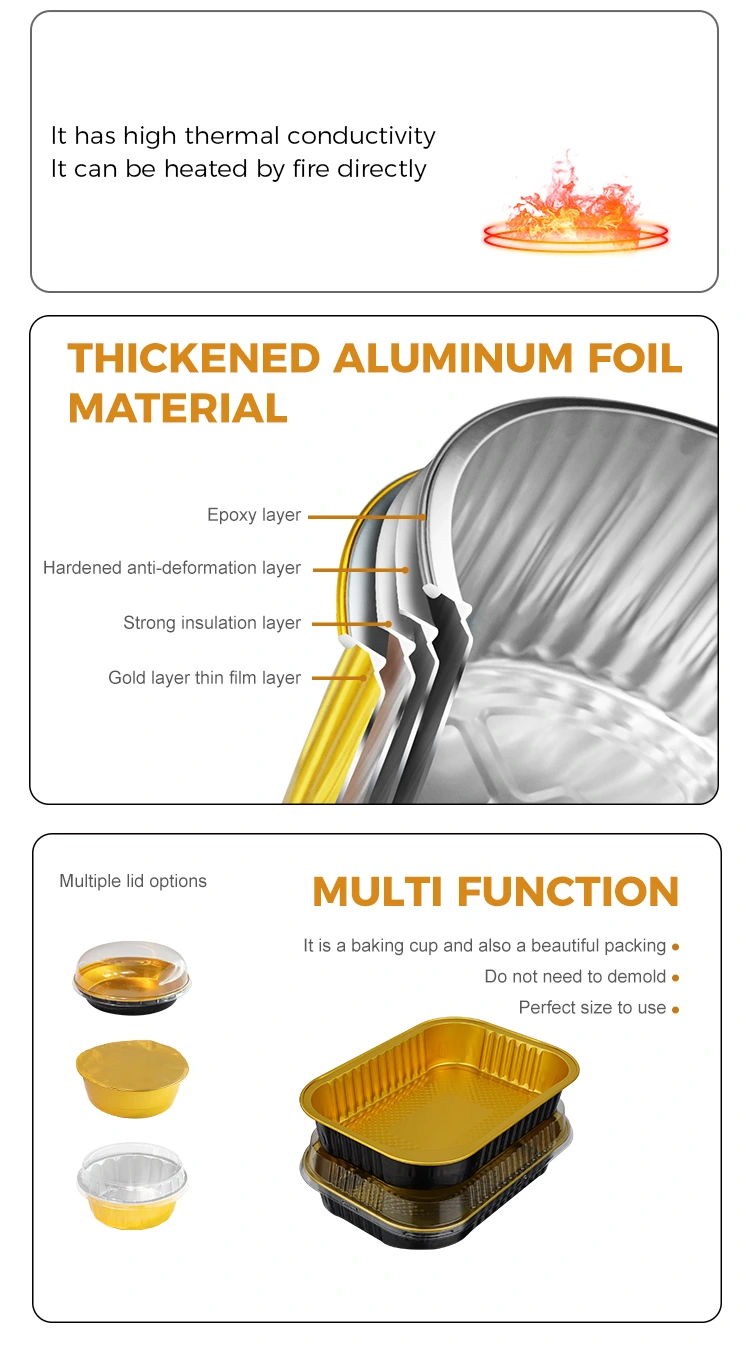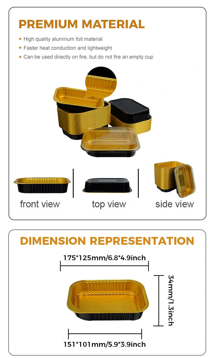 Jednorazowy, prostokątny, lekki pojemnik z folii aluminiowej na wynos firmy Yunchu z folii aluminiowej jest jeszcze rzadszy, ponieważ jest zarówno praktyczny, jak i przyjazny dla środowiska. Materiał folii aluminiowej można poddawać recyklingowi w nieskończoność, co znacznie zmniejsza emisję gazów cieplarnianych. Można go łatwo skompresować po użyciu, łatwo sortować i poddać recyklingowi, a także nie powoduje „białego zanieczyszczenia” jak plastikowe pudełka na drugie śniadanie. Nie tylko wpisuje się w aktualny trend ochrony środowiska, ale także pomaga przedsiębiorstwom budować dobry wizerunek zielonej działalności. Ponadto ma gęstą konsystencję i pełną wytrzymałość. Nie jest łatwo pomarszczyć się lub złamać po ściśnięciu i nie odkształci się pod obciążeniem ciężkimi przedmiotami. Nawet jeśli zapełni się go pełnym pudełkiem gorącej zupy, nie ma potrzeby martwić się o uszkodzenie i wyciekanie zupy. Stosunek ceny do wydajności jest znacznie lepszy niż w przypadku zwykłych plastikowych pudełek na lunch i cienkich pudełek z folii aluminiowej.