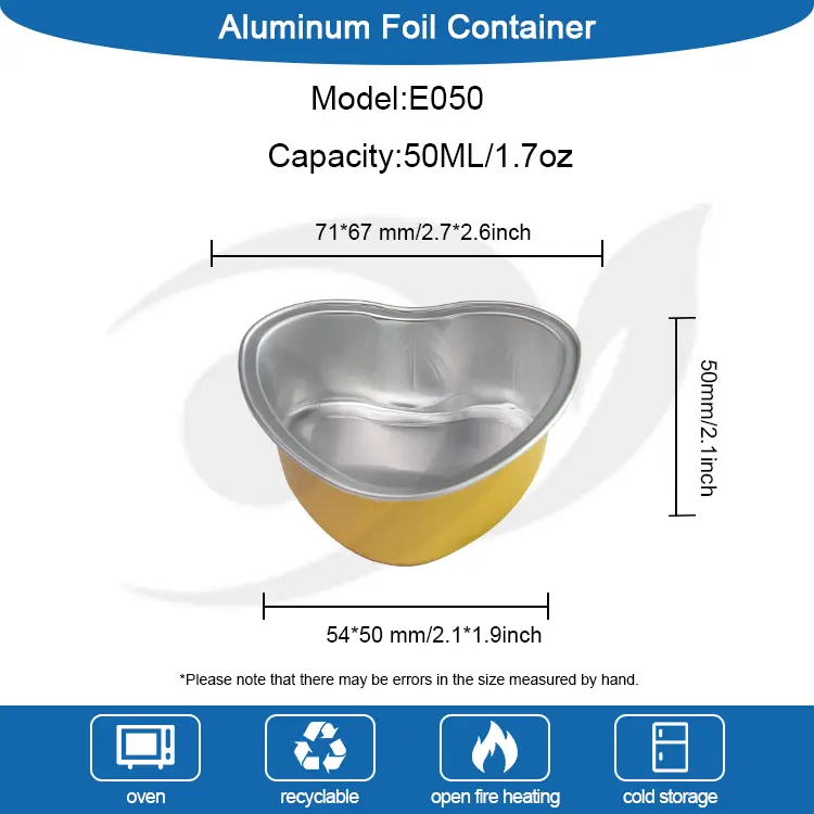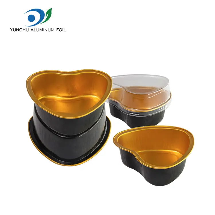 Folia aluminiowa Yunchu Dostawca z sercem Pieczone pojemniki z aluminium aluminium aluminiowa E050 jest specjalnie zaprojektowana i dostosowana do świątecznych pudełek na prezenty, opakowania ślubne, pieczenie, desery i na wynos Małe pudełka opakowaniowe, ten produkt jest prasowany z kompleksami z folii z glin Urodziny i inne miejsca, produkt może być bezpośrednio do piekarnika, frytek powietrza i innych maszyn w celu ogrzewania otwartego płomienia, łatwy do zdeunkcji bez deformacji, ten produkt ma różnorodne kolory, można go dostosować z przezroczystymi czapkami i folią aluminiową.