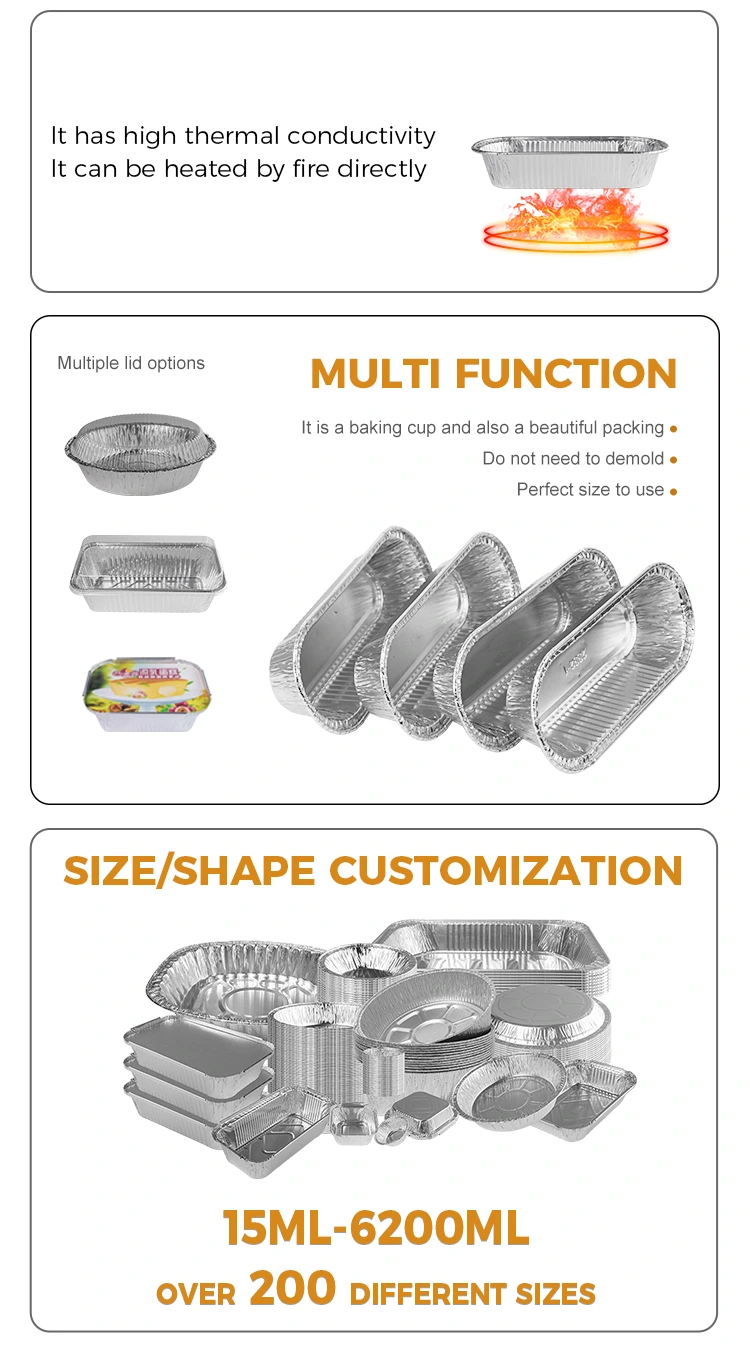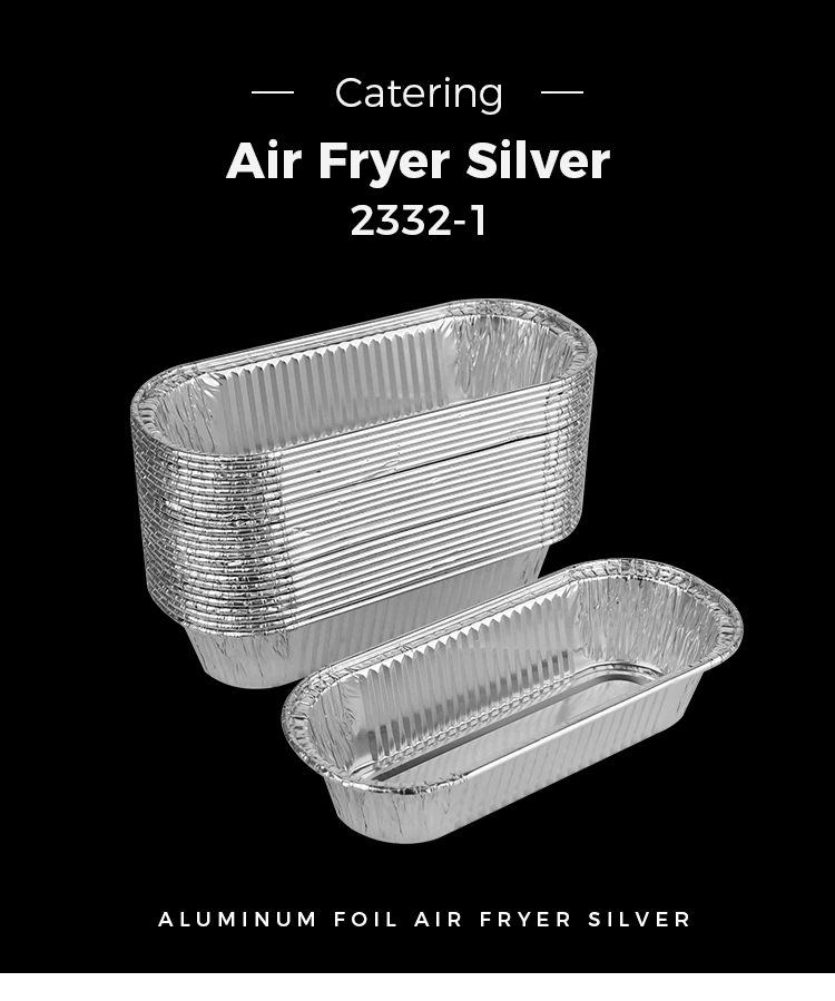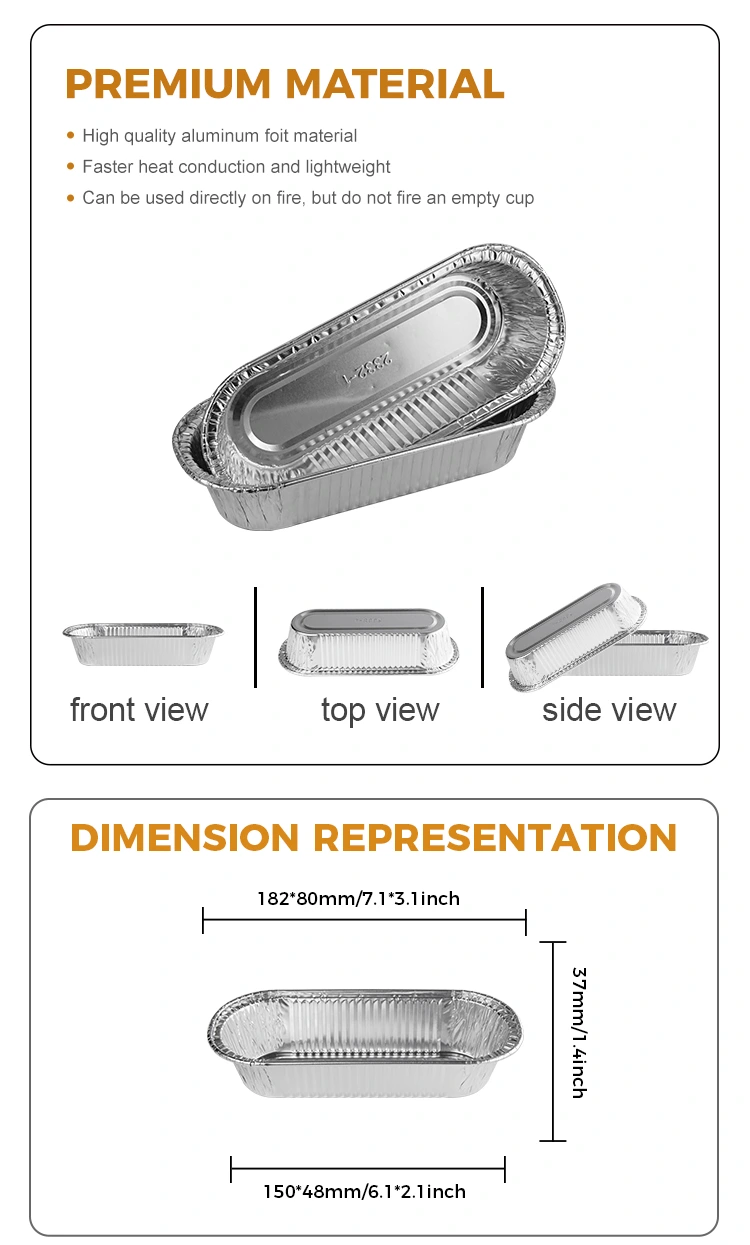 Dostawca folii aluminiowej Yunchu owalny powietrze Fryer Fryer Srebrny pojemniki na folii aluminiowej jest rodzajem pojemnika, który może być używany do parowania, gotowania, pieczenia, pieczenia i innych celów, i może być stosowany do sosów, zanurzania sosów, małych przypisów i próbek pieczenia. Materiał z folii aluminiowej 8011-0, odporność na rozciąganie i odporność na korozję mają dobre wydłużenie, zagęszczony materiał foliowy aluminiowy, trwały i nie łatwy do złamania w woli, hemming, przedni i tylna konstrukcja półkola nie szkodzi rękom, zintegrowane formowanie, powierzchnia ściany jest gładka jak lustro, bogaty rozmiar odpowiedni dla użytku w różnych scenariuszach.