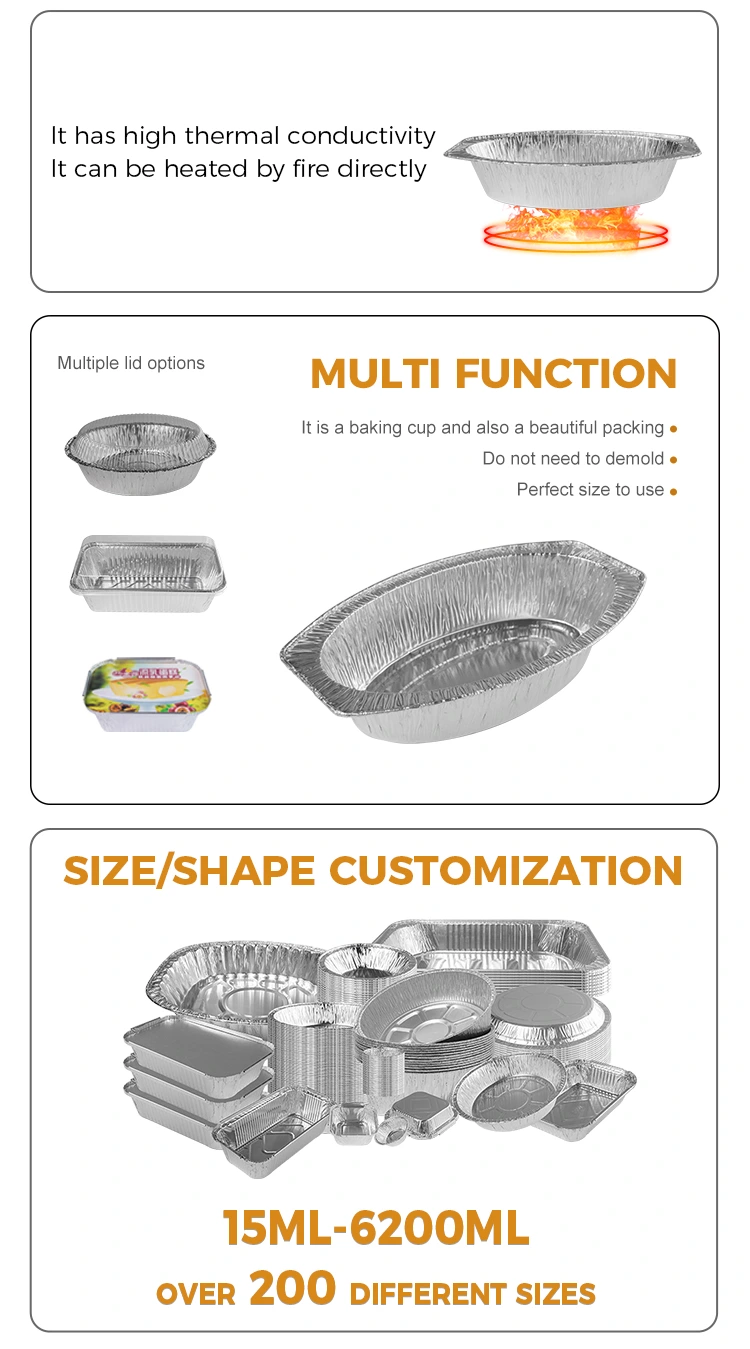 Dostawca folii aluminiowej Yunchu oferuje owalny upieczony chleb srebrny pojemniki na folii aluminiowe do gotowania domowego, piekarni, sklepów z łańcuchem i dostarczania jedzenia chłodniczego. Ten pojemnik, wykonany z materiału foliowego z gastronomicznym, ma unikalny owalny kształt, który wyróżnia się wśród wielu srebrnych pudełek do pieczenia. Ten pojemnik jest szczególnie odpowiedni do trzymania gorących chusteczek, owoców, chleba i wszelkiego rodzaju retortych pokarmów i może zaspokoić potrzeby szerokiej gamy zastaw stołowych. Ze względu na dobrą przewodność cieplną może równomiernie rozproszyć wysokie temperatury, zapewniając równomiernie ogrzewanie żywności. Ponadto ma pewną pojemność obciążenia i odporność na ciśnienie, utrzymując stabilność nawet w przypadku wielu stosów, zapobiegając deformacji i jest idealny do stosowania podczas transportu. Aby lepiej dostosować się do różnych scenariuszy i potrzeb, ten kontener można również dostosować zgodnie z wymaganiami klientów i zapewnić pasujące pokrywki dla dodatkowej praktyczności.