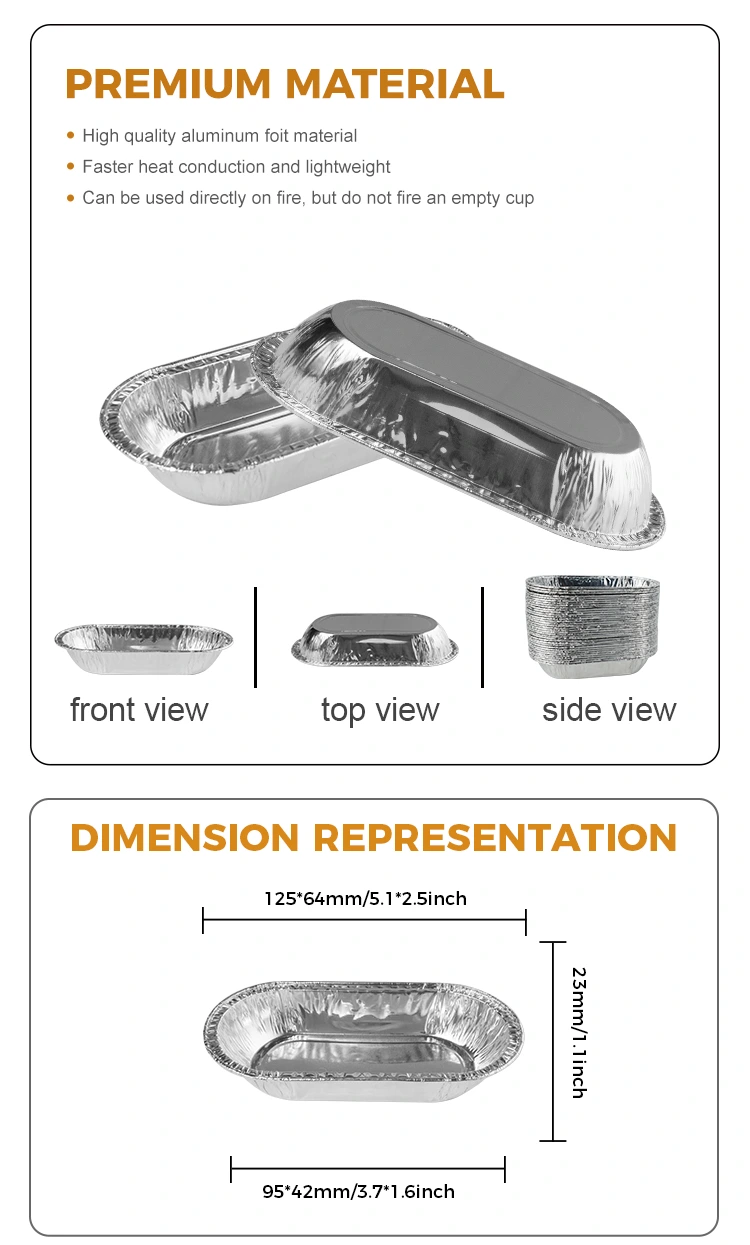 Owalny pojemnik na pieczenie srebrnego folii do pieczenia jest bardzo skromny, o górnej średnicy 125*64 mm (5,1*2,5 cala), średnicy podstawowej 95*42 mm (3,7*1,6 cala), wysokość tylko 23 mm (1,1 cala) i pojemność 105 ml (3,7 mm). Ten rozmiar jest nie tylko łatwy do przenoszenia, ale także może zaspokoić różne potrzeby użytkowania.
