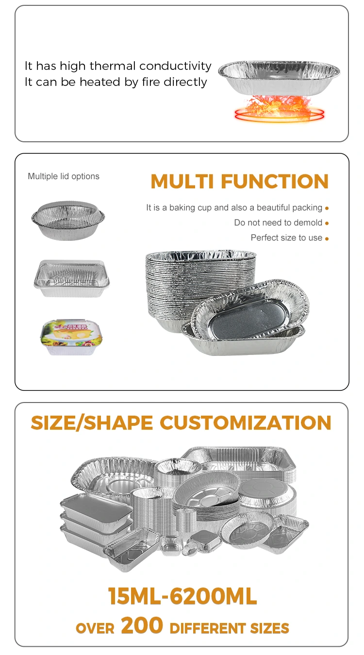 Owalny pieczeń srebrny aluminiowy pojemnik na żywność 6005 nadaje się do gastronomicznej platformy dostarczania na wynos, duży bankiet, bufet i inne okazje, i może być stosowany do przechowywania małych ciast, herbatników, czekoladek, sosów i innych produktów spożywczych. Niezależnie od tego, czy jest to połączone z różnymi sosami, czy jako dodatek do pieczonych deserów, to kompaktowe pudełko foliowe jest doskonałym dodatkiem do twojego dania. Lekki i trwały, pojemnik jest wykonany z wysokiej jakości folii aluminiowej i ma na górze niestandardową przezroczystą pokrywkę zwierząt domowych oraz stałą pokrywkę na dnie, aby zapobiec przyklejeniu jedzenia do blachy do pieczenia, ułatwiając zwalnianie i czyszczenie, a także łatwy w transporcie i użytkowaniu.
