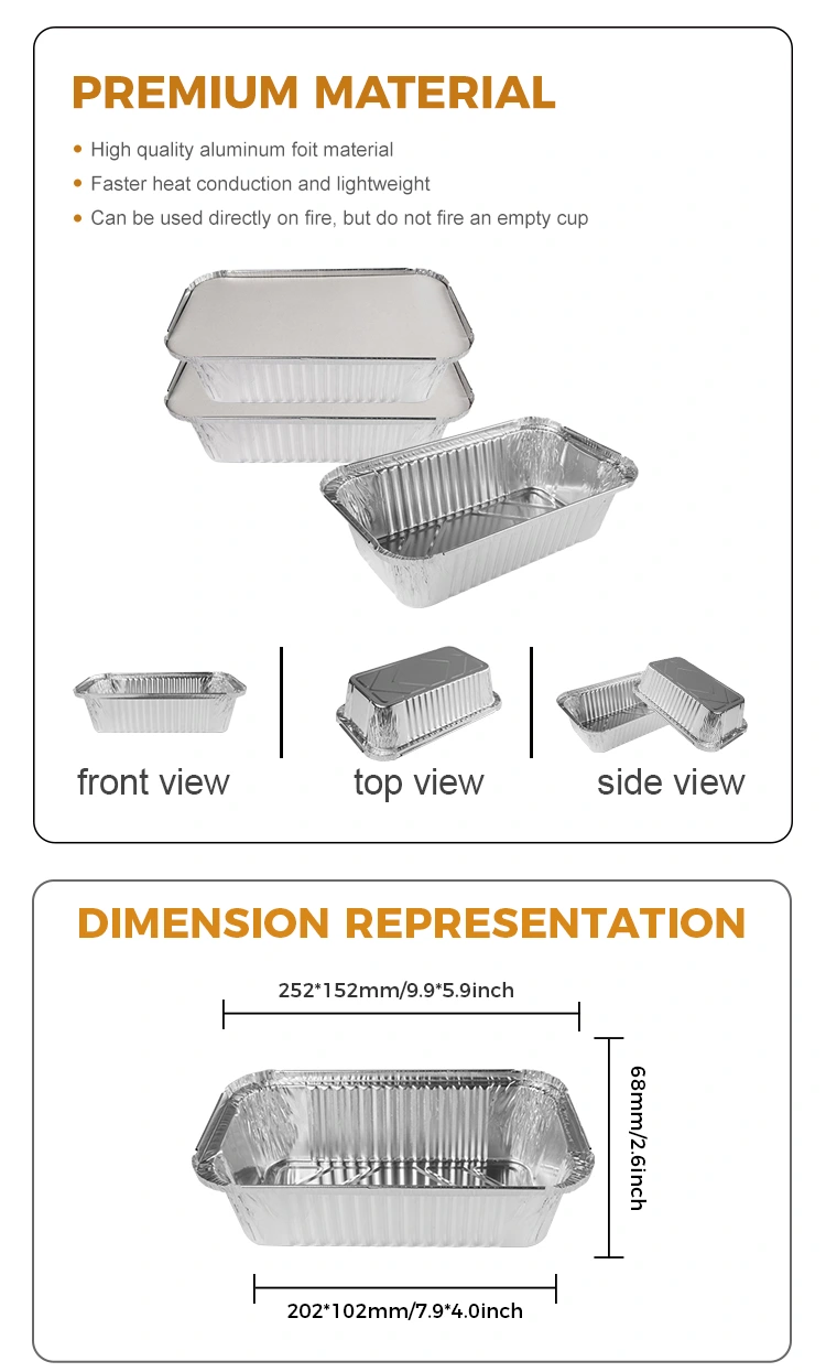 Yunchu aluminum foil supplier Rectangular air fryer packing Silver Aluminum Foil Containers, longer thermal insulation, long barbecue aluminum foil container, hygienic and healthy material, can directly contact food, selected high-quality aluminum foil material, reliable product quality, heat preservation, retain the original taste of food, lock the heat of food, enjoy healthy food, large portion loading, no need to clean laboriously, can Pomyśl o większości jedzenia, można stosować z pokrywą folii aluminiowej, jedną z boku folii aluminiowej, białej karty z jednej strony. Powierzchnia folii aluminiowej jest odporna na olej i wodoodporna, a strona folii aluminiowej jest skierowana w dół. Wsparcie kombinacji folii aluminiowej zamawianie hurtowe może zapewnić dostosowywanie drukowania wzorów, pojedynczy MOQ 1000 sztuk/więcej, ten prostokątny kontener folii z grilla srebrnego aluminium ma różne specyfikacje i modele do wyboru, możesz skontaktować się z personelem sprzedaży w celu zapytania.