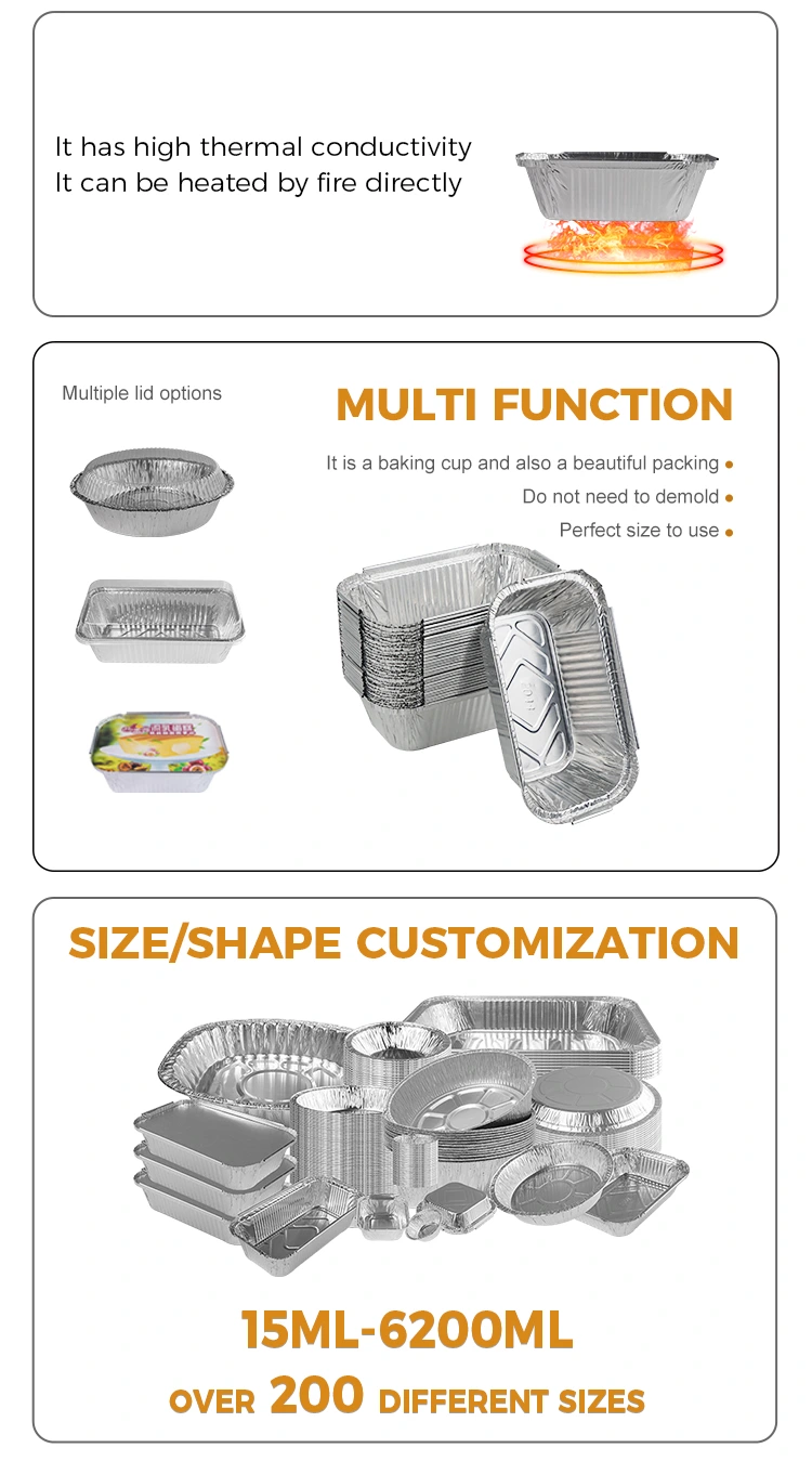 Funkcje: Dostarczone przez nas pudełko na lunch folii aluminiowej wykonuje się z materiału foliowego z aluminium 8011, który ma doskonałą wydajność zachowania ciepła i może skutecznie utrzymać temperaturę żywności, dzięki czemu jedzenie jest bardziej atrakcyjne. W szczególności nasze prostokątne pojemniki na srebrne folii z pensjonatów srebrne ma nie tylko właściwości izolacji termicznej, ale można je również połączyć z pokrywkami folii aluminiowej lub plastikowymi pokrywkami, aby ułatwić spersonalizowane dostosowywanie logo, zwiększając punkty pamięci klienta i zwiększając świadomość marki.