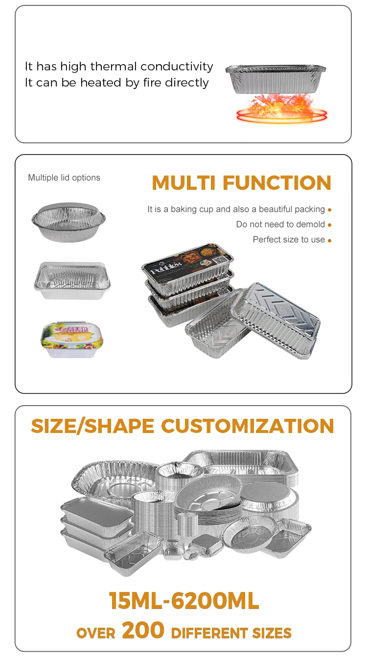 Dostawca folii aluminiowej Yunchu, prostokątny grilla zagęszczone srebrne pojemniki z folii aluminiowej, jest dobrym pomocnikiem do grilla, gorącego garnka, pieczenia, opakowania na wynos, różnorodne umiejętności gotowania można wykonać w pudełku, różne rozmiary są odpowiednie dla różnych garnków i wyposażenia itp. Zastosowania, odporność na ciepło i olej, łatwy do pieczenia, grilla na zewnątrz, tymczasowe miski nie boją się ognia, podczas używania, potrzeby umieszczania jedzenia lub zupy, nie sucha bez wody, piekarniki gospodarstwa domowego są czyste i wygodne do usuwania naczyń.
