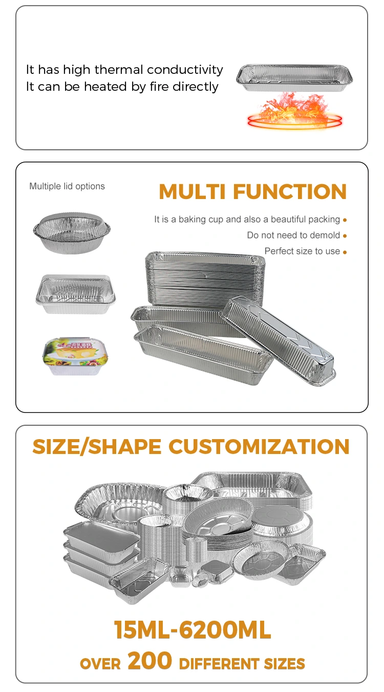 Funkcje: Prostokątne taca do pieczenia srebrnego aluminium pojemniki na folii aluminiowe Zdrowe, przyjazne dla środowiska, materiał z żywności, bezpieczne i nietoksyczne, odnawialne i przyjazne dla środowiska materiały, podkreślające bezpieczeństwo żywności i dążąc do ogólnej jakości produktu.