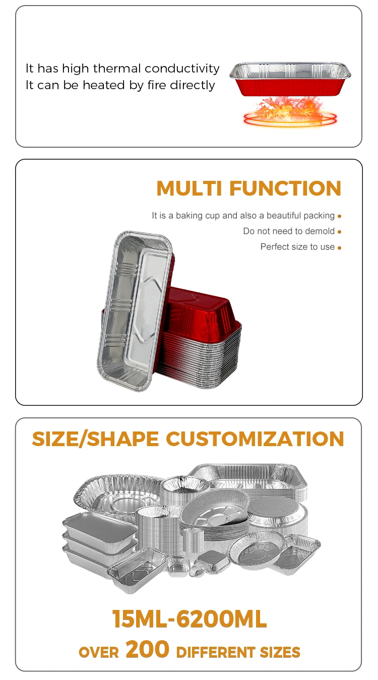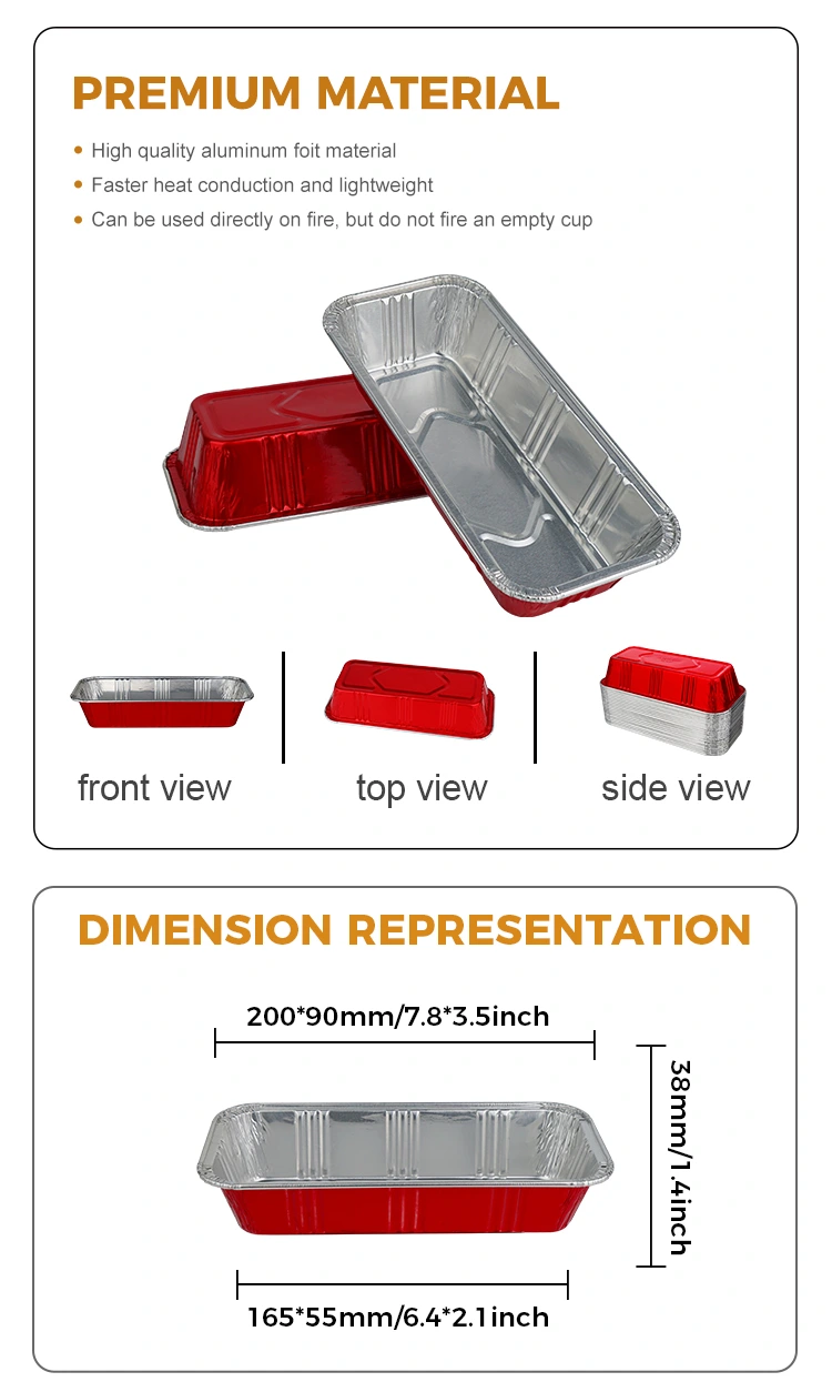 Prostokątna czerwona piekarnia YunChu z folii aluminiowej catering Srebrna folia aluminiowa Pojemniki pieczą się bez szczotkowania olejem, łatwo je wyjmować z formy i uniknąć przyklejania się do blachy do pieczenia; Podczas przechowywania pokrój chleb i zapakuj go do pudełek. Po schłodzeniu jest mniej prawdopodobne, że wchłonie smaki. Po wyjęciu jest lekki i ciepły. Dodaliśmy także funkcję podgrzewania na dużym ogniu w kuchence mikrofalowej, dzięki czemu korzystanie z niej będzie wygodniejsze. Piekarnia może go wykorzystać komercyjnie. Pudełko z folii aluminiowej w kolorze srebrnym ma prostą metaliczną fakturę i może być bezpośrednio wykorzystane jako pojemnik do pakowania gotowych produktów. Po wydrukowaniu logo marki, daty produkcji i sposobu przechowywania może nie tylko wydłużyć okres świeżości pieczywa (o 1-2 dni dłużej niż zwykłe torby foliowe w temperaturze pokojowej), ale także zwiększyć rozpoznawalność produktu i zachęcić konsumentów do zakupu. Tymczasem pudełka z folii aluminiowej można układać w stosy do przechowywania, oszczędzając przestrzeń magazynową dla piekarni. Wyjmując je, nie ma potrzeby ich osobnego rozpakowywania, co przyspiesza efektywność serwowania. W przypadku dań bufetowych pudełko z folii aluminiowej, które zachowuje ciepło, pozwala utrzymać ciepło chleba na stole w jadalni (ze wahaniami temperatury nie większymi niż 5 ℃ w ciągu 2 godzin), unikając wielokrotnego podgrzewania, które mogłoby spowodować wysuszenie i stwardnienie tekstury. Indywidualna konstrukcja pudełka ułatwia gościom zabranie go w razie potrzeby, zmniejszając ryzyko higieniczne spowodowane wielokrotnym dotykaniem szczypcami. Może również spowolnić tempo utleniania chleba wystawionego na działanie powietrza i zmniejszyć ilość odpadów.