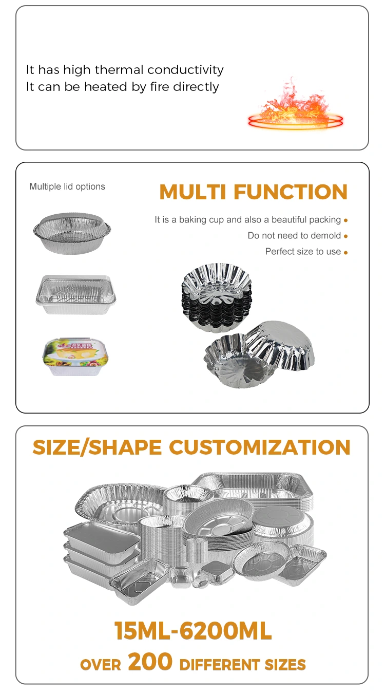 Yunchu aluminiowy dostawca folii okrągły jaja tartę pieczenie srebrne aluminiowe pojemnik na żywność. Ta taca jajka wygląda nie tylko pięknie, ale także zwraca szczególną uwagę na praktyczność i bezpieczeństwo. Ta taca na jajka ma niepotrzebną konstrukcję kubka z niepotrzebną teksturą, która zwiększa tarcie i skutecznie zapobiega zwalnianiu jedzenia, dzięki czemu wyniki pieczenia są bardziej stabilne. Po drugie, jego konstrukcja w ustach koronki można złożyć i przechowywać, co jest zarówno oszczędzane, jak i przenośne, co czyni go idealnym dla rodzin lub małych zakładów gastronomicznych. Taca na jajka jest wykonana z folii aluminiowej klasy żywnościowej, która powstaje jednocześnie i nie musi być czyszczona, co znacznie poprawia wydajność użytkowania. Jest odpowiedni dla wszystkich rodzajów kuchni, niezależnie od tego, czy są to pieczone tarty, ciasta, ciasta żółtka, ciastka miski, można je doskonale zaprezentować. Ta taca na jajka przekazała niemiecki certyfikat ERP, certyfikat UE SGS oraz certyfikat systemu zarządzania jakością ISO9001, zapewniając bezpieczeństwo i ochronę środowiska produktu. Wszystkie nasze surowce są zdrowymi i przyjaznymi dla środowiska materiały spożywcze, które spełniają międzynarodowe standardy bezpieczeństwa żywności, dzięki czemu można jeść z pewnością.
