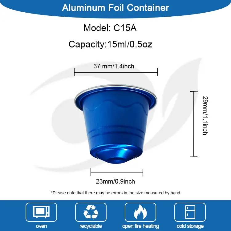 Dostawcy folii aluminiowej Yunchu oferują stożkową silikonową kapsułkę bez urzeczywistniania kawy odpowiednie dla większości maszyn do kawy, które można wykorzystać do pakowania cieczy espresso, a nawet przedłużenia okresu trwałości przez płukanie azotu. Ponadto można dostosować logo i kolory, a wzory można wydrukować na uszczelnieniu folii aluminiowej, a stemping logo można również wykonać na dnie kapsułki kawy. Wymiary kapsułki są następujące: górna średnica 37 mm (około 1,4 cala), średnica podstawy 23 mm (około 0,9 cala), wysokość 29 mm (około 1,1 cala).