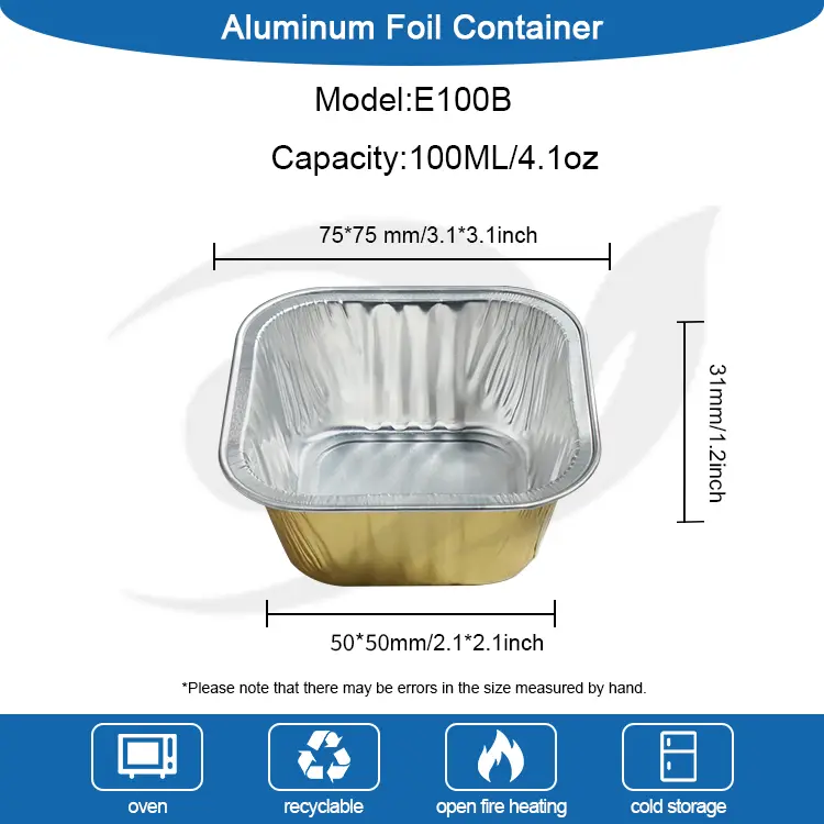 Fabryczne folii z folii glinu junchu hurtowe kwadratowe ciasta pieczeniowe pojemniki na folii gotźnia gotźnia aluminiowa E100B to niewielka pojemność aluminiowa folia opakowań zaprojektowany do przechowywania fali i żywności, specjalnie zaprojektowany do małych herbatników, sosów, zwierząt domowych, przypraw, wypraw, pieczenia próbek i itp. Projekt struktury lustra i usztywniający, piękny i praktyczny, może skutecznie poprawić ogólną brak poślizgu i teksturę opakowania, szczególnie odpowiednich do delikatnego poszycia i karmy dla zwierząt domowych oraz innych scenariuszy aplikacji.