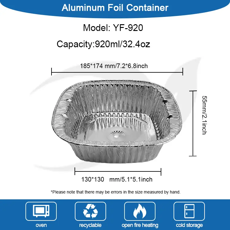 Yunchu wykonany w Chin Model Square srebrny pojemnik na srebrny kontener folii z folii aluminiowej jest bardzo skromny, o górnej średnicy 185*174 mm (7,2*6,8 cala), pojemności 920 ml 130*130 mm). Ten rozmiar jest nie tylko łatwy do przenoszenia, ale także może zaspokoić różne potrzeby użytkowania.