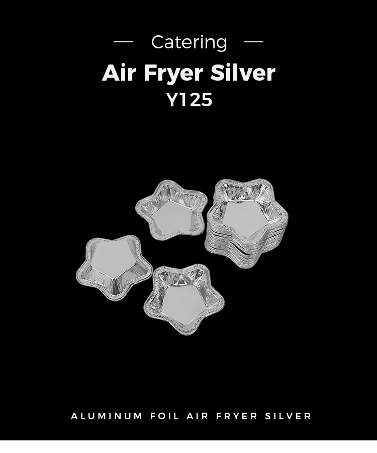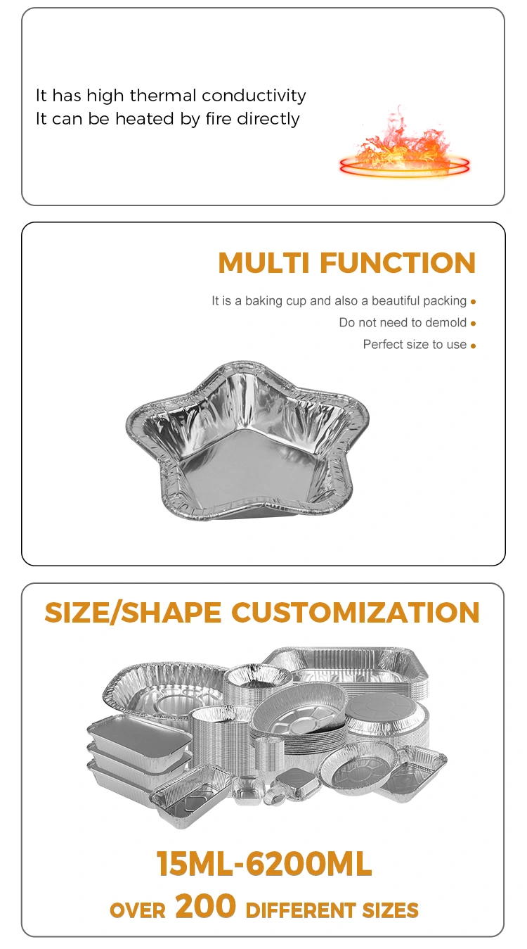 Dostawca folii aluminiowej Yunchu Kubki do tarty z folii aluminiowej w kształcie gwiazdy do pieczenia Pojemnik na żywność z folii aluminiowej to wysokiej jakości pojemnik z folii aluminiowej do pieczenia w kolorze srebrnym. Produkt ten jest praktyczny i skutecznie rozwiązuje problemy podczas robienia tart lub małych potraw, takich jak mycie patelni i pozostałości tłuszczu. Wewnętrzne i zewnętrzne ścianki dna foremek do tarty z folii aluminiowej w kształcie gwiazdy do pieczenia Pojemnik na żywność z folii aluminiowej są zaprojektowane tak, aby były gładkie, zapobiegając przywieraniu po upieczeniu i przypalaniu na dnie.